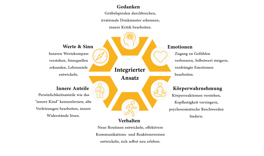 Mein therapeutischer Ansatz verbindet zentrale Elemente der humanistischen, kognitiv-verhaltenstherapeutischen und sinnorientierten Psychotherapie. So entsteht ein ganzheitliches und flexibles Angebot, das auf Ihre individuellen Bedürfnisse abgestimmt ist. Im Mittelpunkt stehen dabei sechs miteinander verbundene Ansatzpunkte, die – je nach Persönlichkeit und Anliegen – unterschiedlich gewichtet werden können: